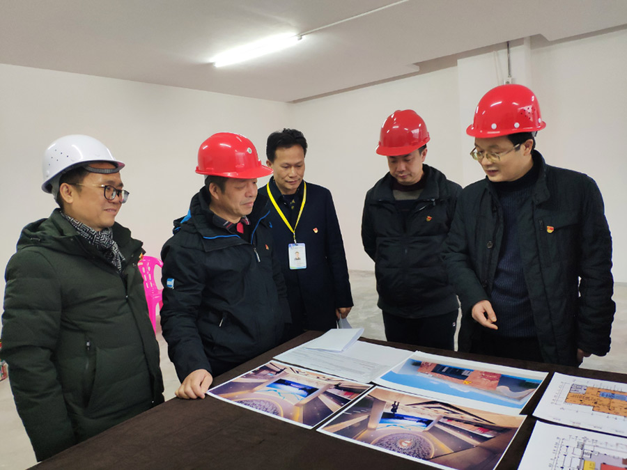 圖為周道林向工委領(lǐng)導(dǎo)介紹黨群服務(wù)中心設(shè)計(jì)效果圖相關(guān)情況