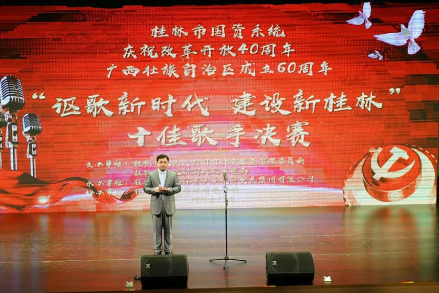 本次比賽旨在慶祝中華人民共和國成立69 周年、廣西壯族自治區(qū)成立60 周年,禮贊黨的十九大描繪的新時代宏偉藍(lán)圖。豐富國資系統(tǒng)干部職工的業(yè)余文化生活,謳歌國資系統(tǒng)干部職工圓夢新時代、建功新時代的豪情壯志,增強(qiáng)國資系統(tǒng)干部職工投身桂林國際旅游勝地建設(shè)的緊迫感、責(zé)任感和使命感。