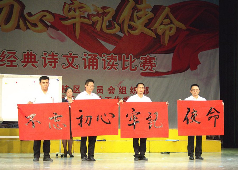 活動中,選手們通過朗誦紅色經(jīng)典詩詞,深情回顧黨的光輝歷程、謳歌黨的豐功偉績,真誠地表達了對黨、對祖國的擁護與熱愛之情。參賽選手們儀態(tài)莊重大方,朗誦聲情并茂,以配樂、舞蹈、書法展示等多種形式,或深情款款、或激情高昂,用飽滿的熱情將紅色經(jīng)典的內(nèi)涵精彩地展現(xiàn)在觀眾面前,充分展示了臨桂區(qū)廣大黨員干部的良好精神風(fēng)貌。新城投資集團黨支部四名黨員聲情并茂地共誦《不忘初心,牢記使命,我們永遠(yuǎn)在路上》,節(jié)目形式新穎,選手感情充沛,朗讀完詩歌后,黨員譚佳璐現(xiàn)場飽含情感的用毛筆書寫了“不忘初心,牢記使命”八個大字,表達了黨員們樹立遠(yuǎn)大的理想、力爭上游、為祖國的強盛貢獻力量的決心。與其說這是紅色經(jīng)典詩文誦讀,不如說這是一次視聽盛宴,更是黨員們愛黨愛國的精彩演繹。