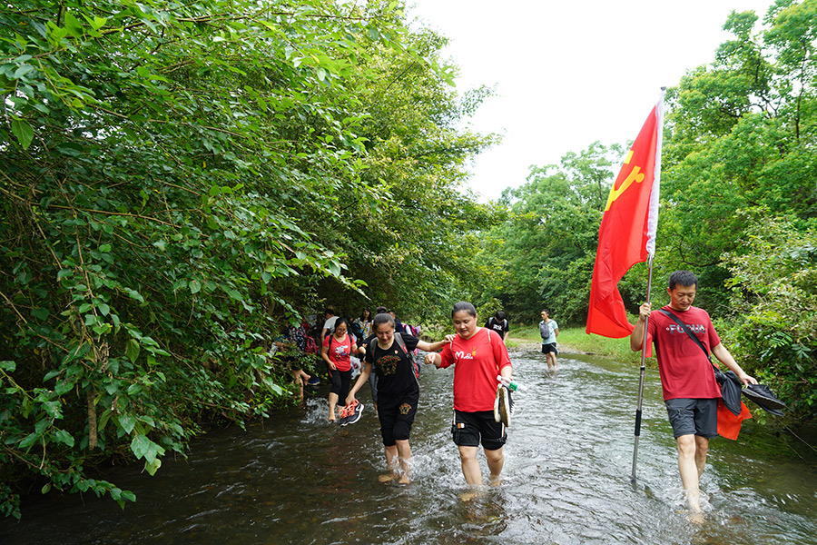 大雨過后,烈日當(dāng)空,地表溫度迅速上升,空氣中的水蒸氣增多,汗液難于蒸發(fā),面對濕熱天氣,大家義無反顧的前進(jìn),衣服濕了又干,干了又濕。中午14點,隊伍進(jìn)入一片樹林,起初地勢較為平坦、道路開闊……漸漸地,地面開始凹凸不平,有了越來越多的水坑,道路開始變窄,一條小溪攔住了隊伍。大家紛紛脫鞋下水,手拉著手、攙扶著后面的同志在溪水中行進(jìn),本著不能讓任何一個同志掉隊的信念,整個團(tuán)隊相互鼓勁、相互扶持,克服困難,攜手踏過這段溪流。