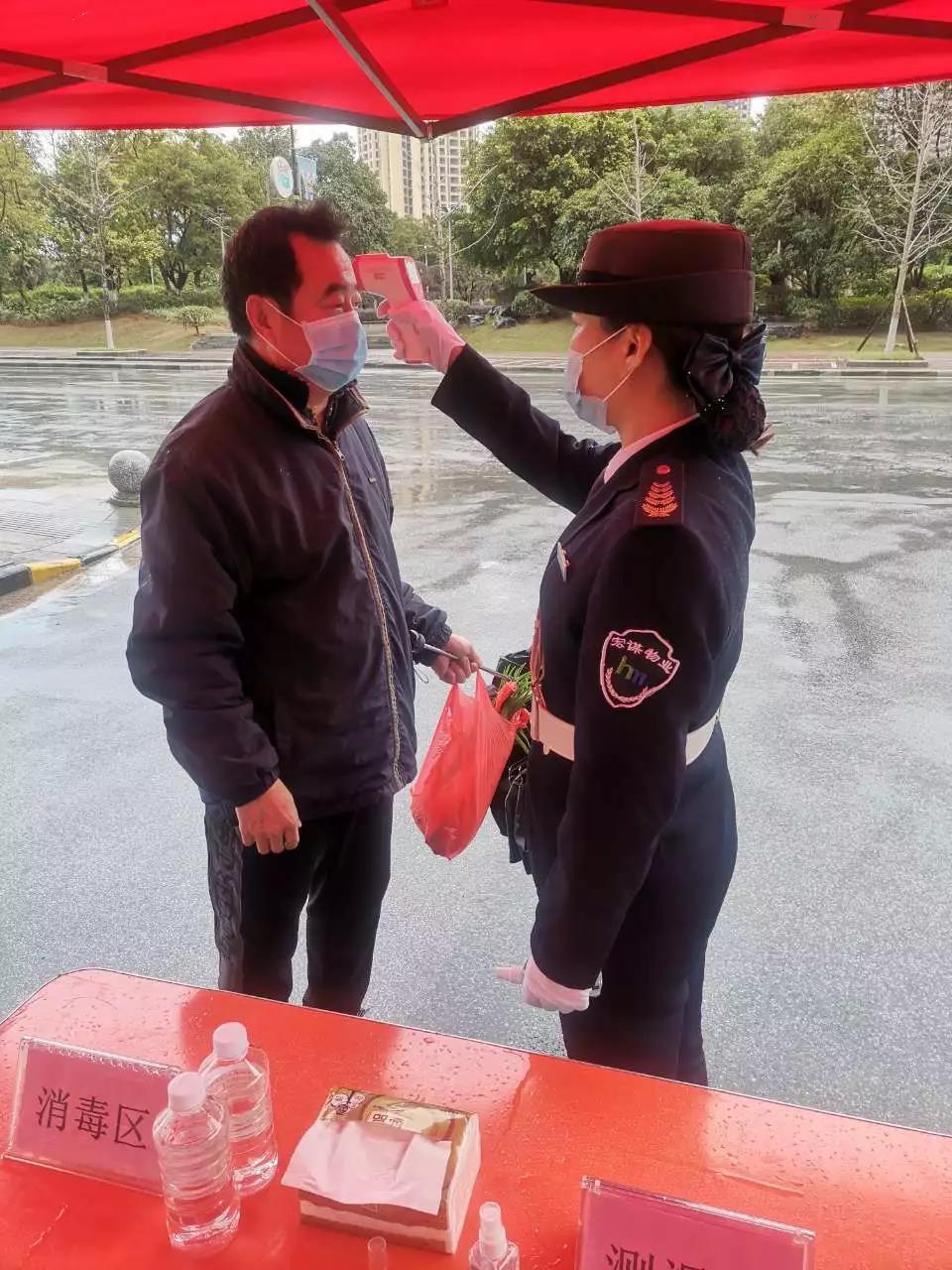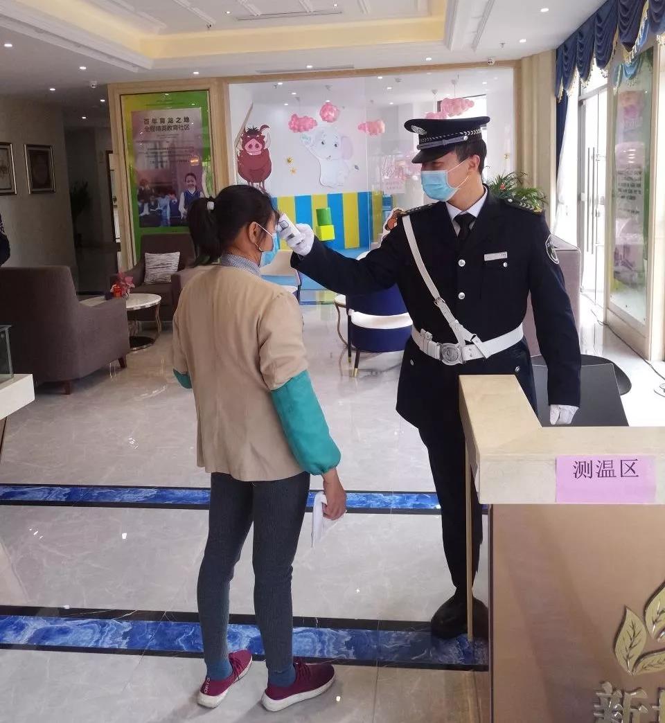 ▲新城國奧花園營銷中心疫情防控崗在為保潔人員測體溫。