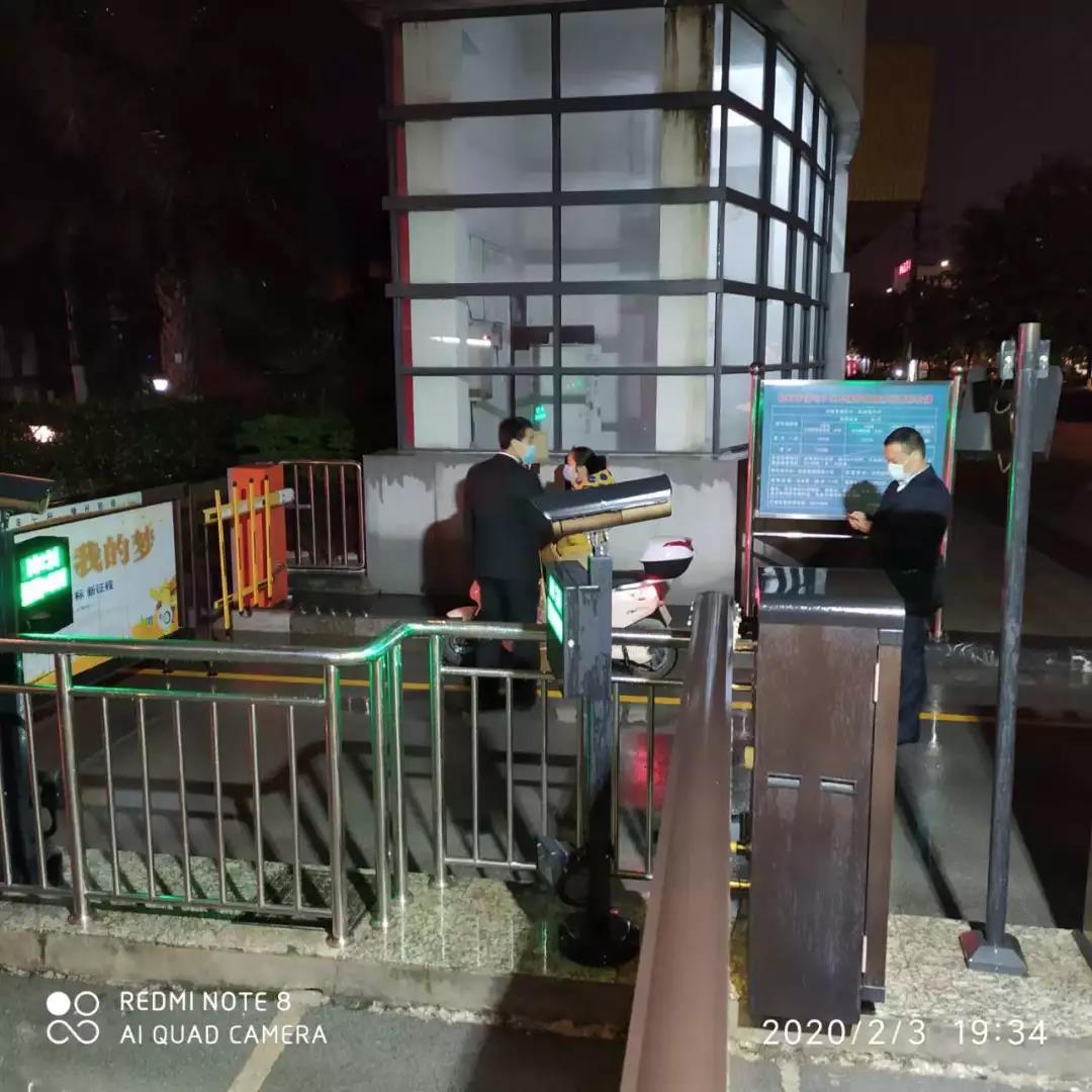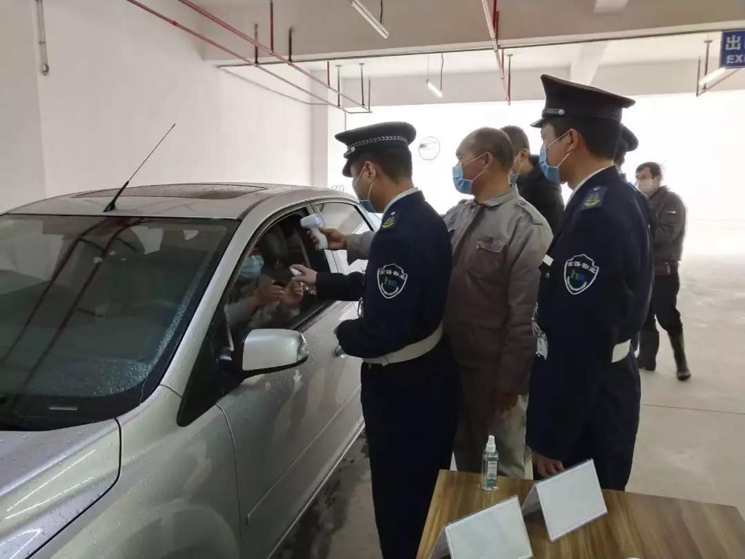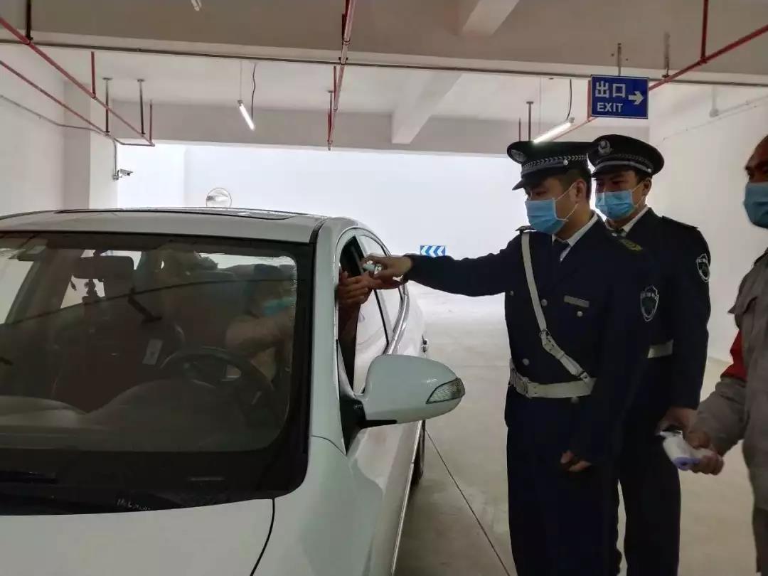 ▲地下停車場也設立了疫情防控崗,為進入停車場停車人員測體溫、噴灑酒精消毒。