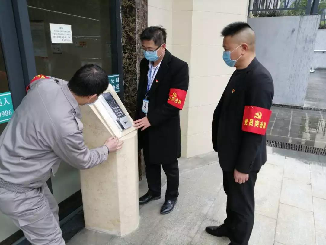 ▲黨員突擊隊正在更換小區(qū)對講系統(tǒng)、電梯按鍵防菌用塑料膜和按電梯專用紙。