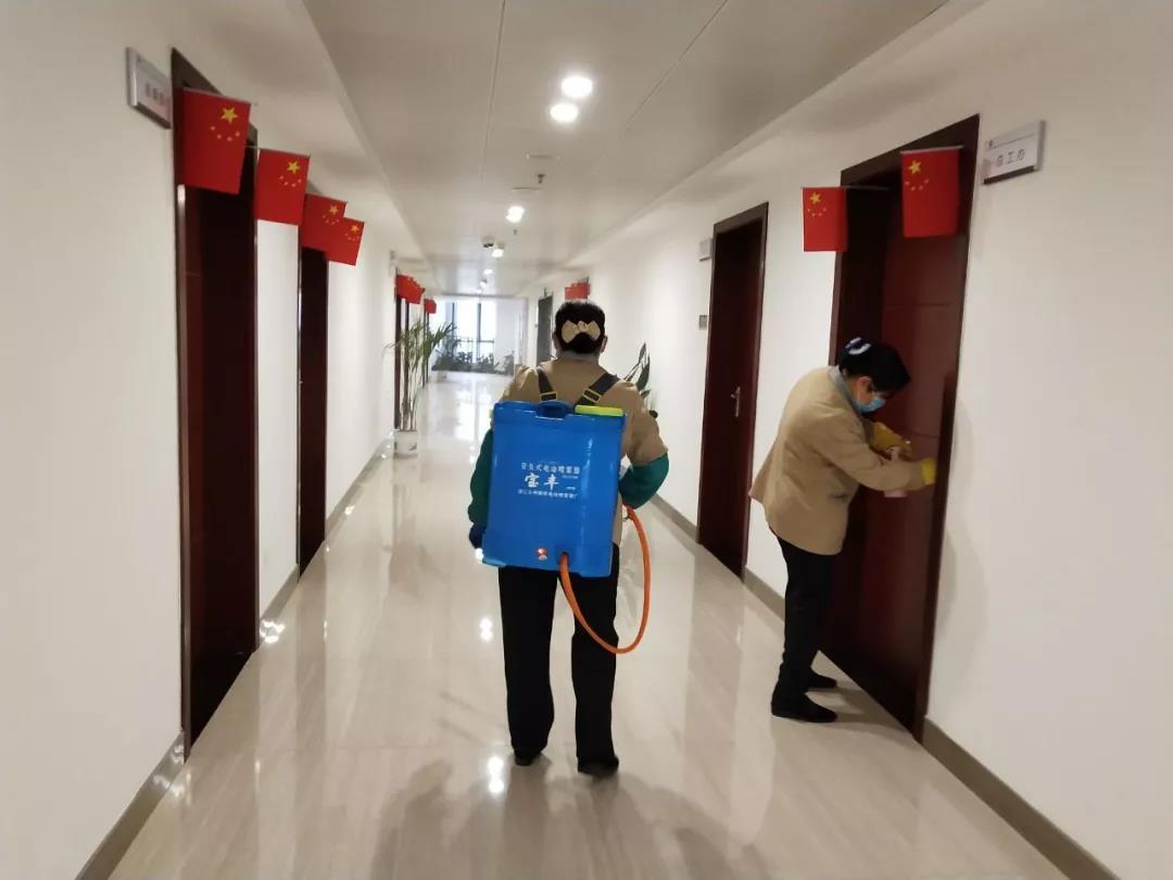 ▲保潔人員在對電梯、出入門廳、辦公區(qū)域、樓梯間、衛(wèi)生間等地進行全面消毒。