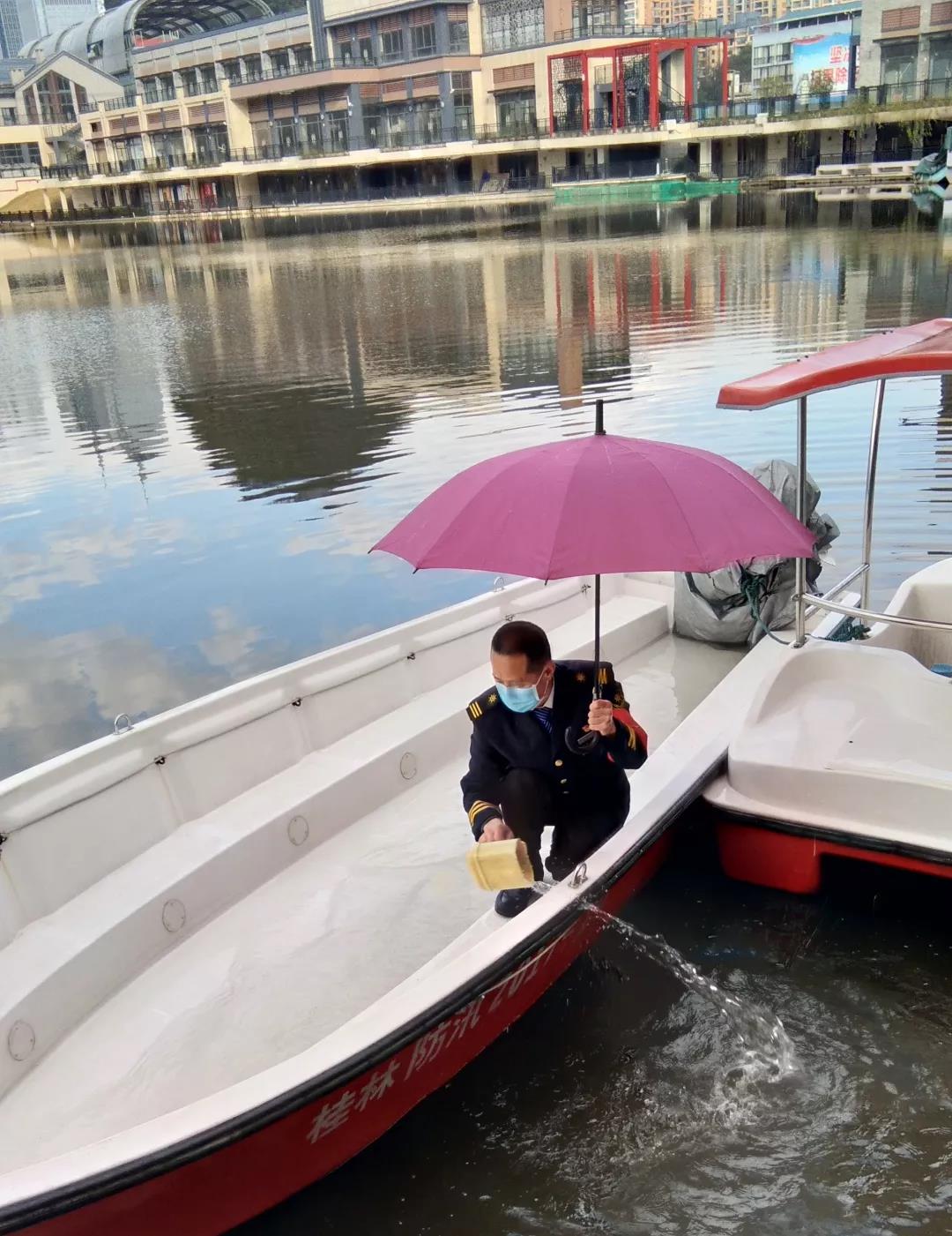 ▲黨員突擊隊成員黃雙財同志一人處理游船積水。