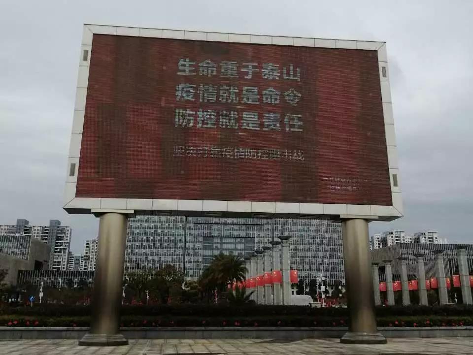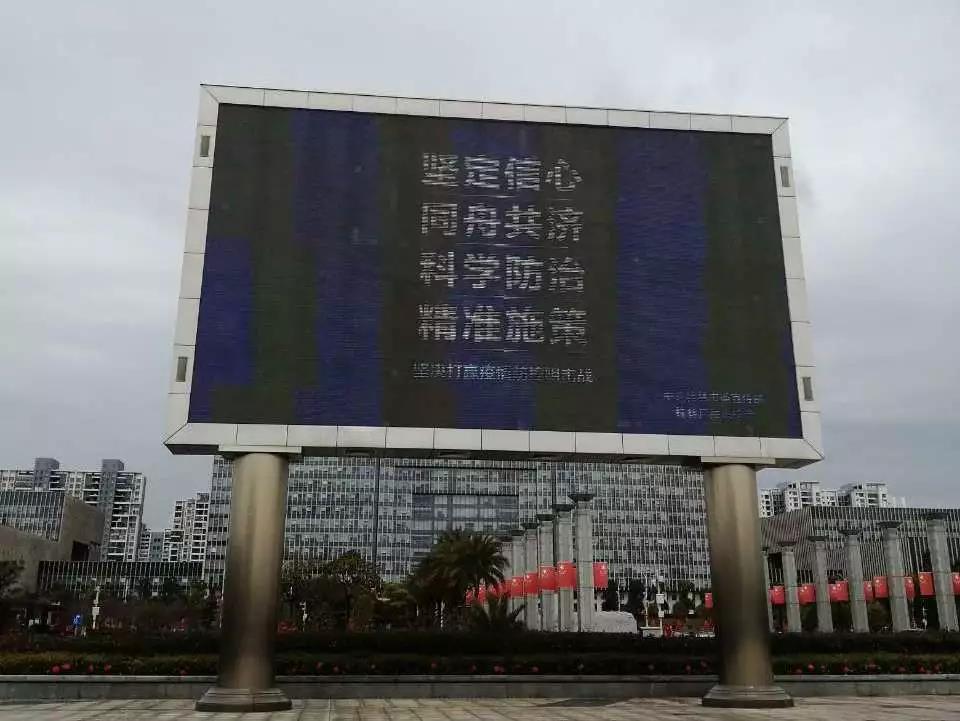 ▲市民廣場LED屏幕播放防疫宣傳信息。