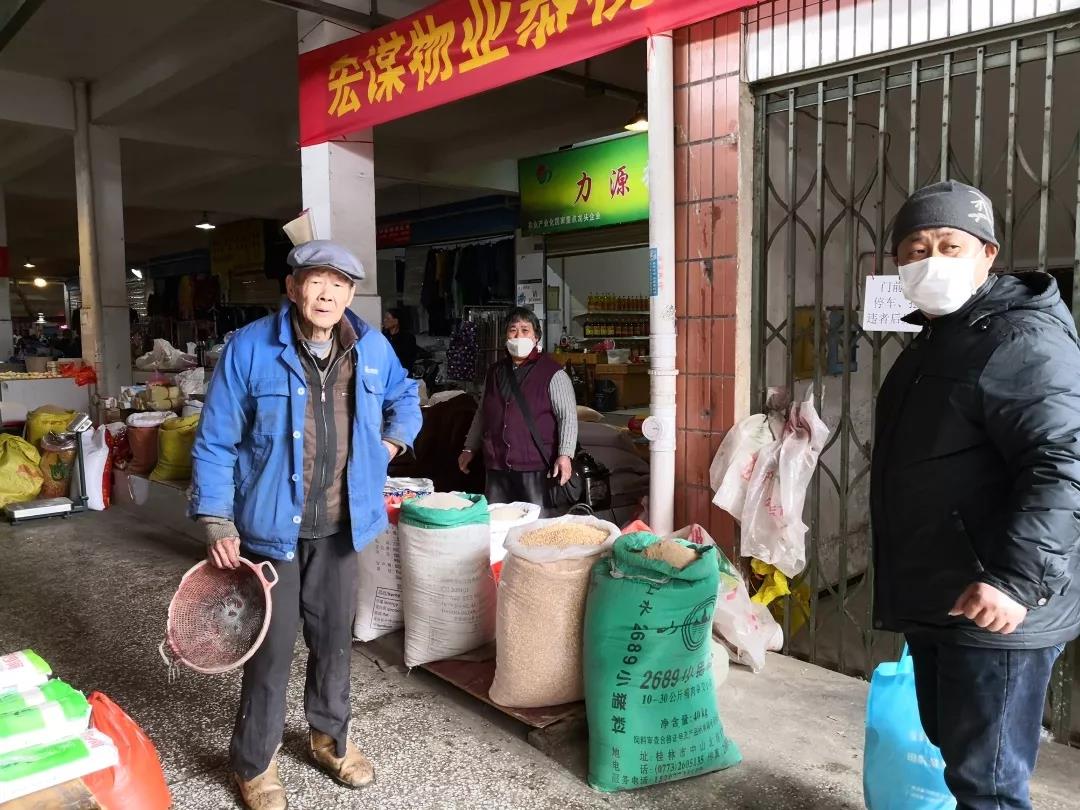 ▲橡膠公司項目工作人員與市場管理人員對市場及各門面進行防疫工作排查,并提醒市民戴口罩出行。