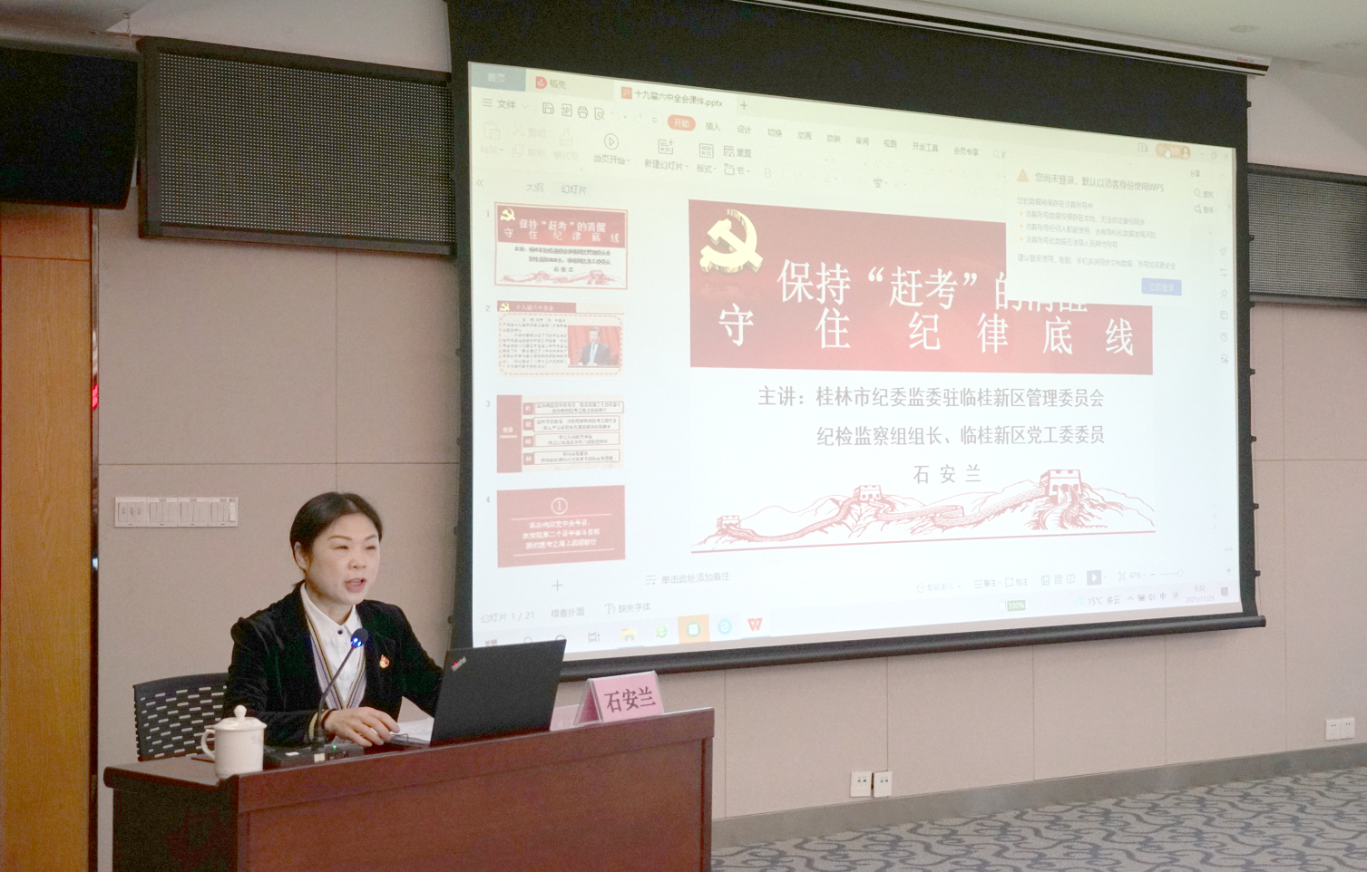 市紀委監(jiān)委駐臨桂新區(qū)管委會紀檢監(jiān)察組組長、臨桂新區(qū)黨工委委員石安蘭開展集體廉政談話暨《保持“趕考”的清醒 守住紀律底線》黨課