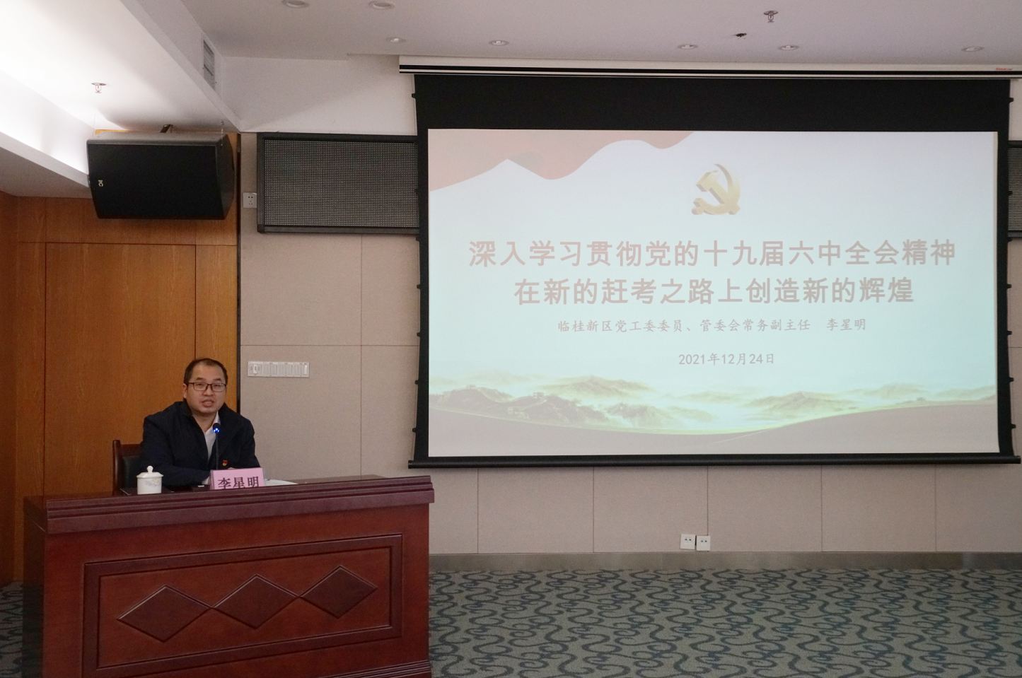 為深入學(xué)習(xí)貫徹黨的十九屆六中全會(huì)精神,按照臨桂新區(qū)黨工委統(tǒng)一部署,2021年12月24日,臨桂新區(qū)黨工委委員、管委會(huì)常務(wù)副主任李星明到新城投資集團(tuán)作黨的十九屆六中全會(huì)精神宣講報(bào)告。新城投資集團(tuán)黨總支書(shū)記、董事長(zhǎng)周道林主持會(huì)議。