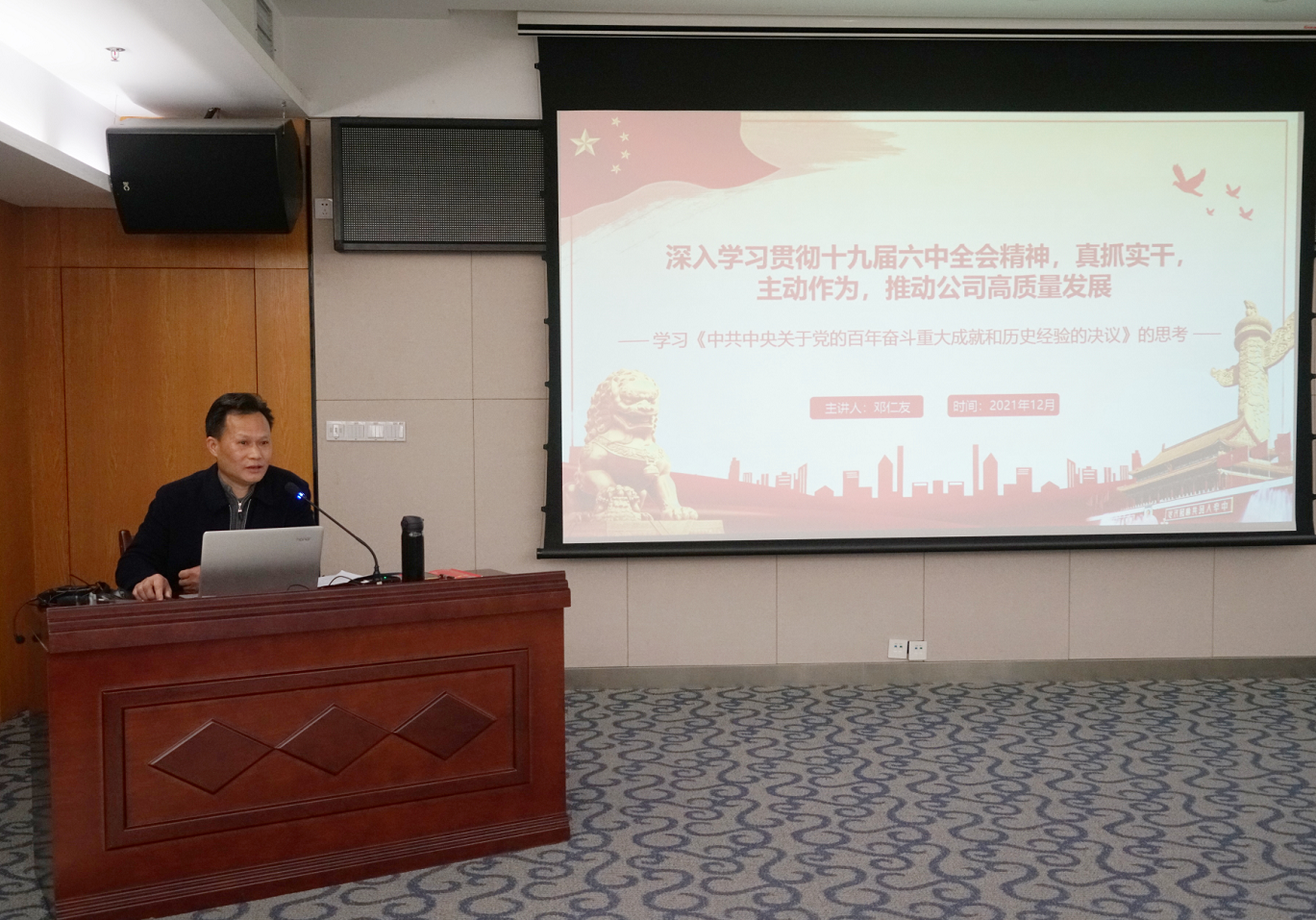 集團黨總支副書記、副總經(jīng)理鄧仁友,黨總支組織委員、工會主席譚力源,黨總支統(tǒng)戰(zhàn)委員、副總經(jīng)理張新悅分別以《深入學(xué)習(xí)貫徹十九屆六中全會精神,真抓實干,主動作為,推動公司高質(zhì)量發(fā)展》《學(xué)習(xí)貫徹黨的十九屆六中全會精神——我們走在趕考的大路上》《十九屆六中全會公報》為主題,圍繞學(xué)習(xí)貫徹十九屆六中全會精神和全會通過的《中共中央關(guān)于黨的百年奮斗重大成就和歷史經(jīng)驗的決議》,從深刻認識黨的十九屆六中全會的重大意義,黨的百年奮斗歷史經(jīng)驗和新時代中國特色社會主義的歷史性成就等方面進行了深入解讀。