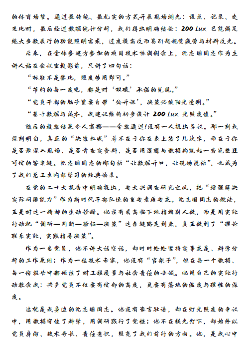 為確保比賽的專業(yè)性與公正性,集團(tuán)黨委聯(lián)合第三黨支部委員及群眾代表組成評(píng)審小組,從主題性、感染力、文字表達(dá)、創(chuàng)新性四個(gè)維度對(duì)作品進(jìn)行綜合評(píng)分。經(jīng)過層層篩選,最終評(píng)選出一等獎(jiǎng)2名、二等獎(jiǎng)1名、三等獎(jiǎng)3名、優(yōu)秀獎(jiǎng)5名。獲獎(jiǎng)作品既有對(duì)黨員先進(jìn)事跡的深度刻畫,也有對(duì)黨性精神的深刻詮釋,充分反映了參賽者的真情實(shí)感與創(chuàng)作水平。