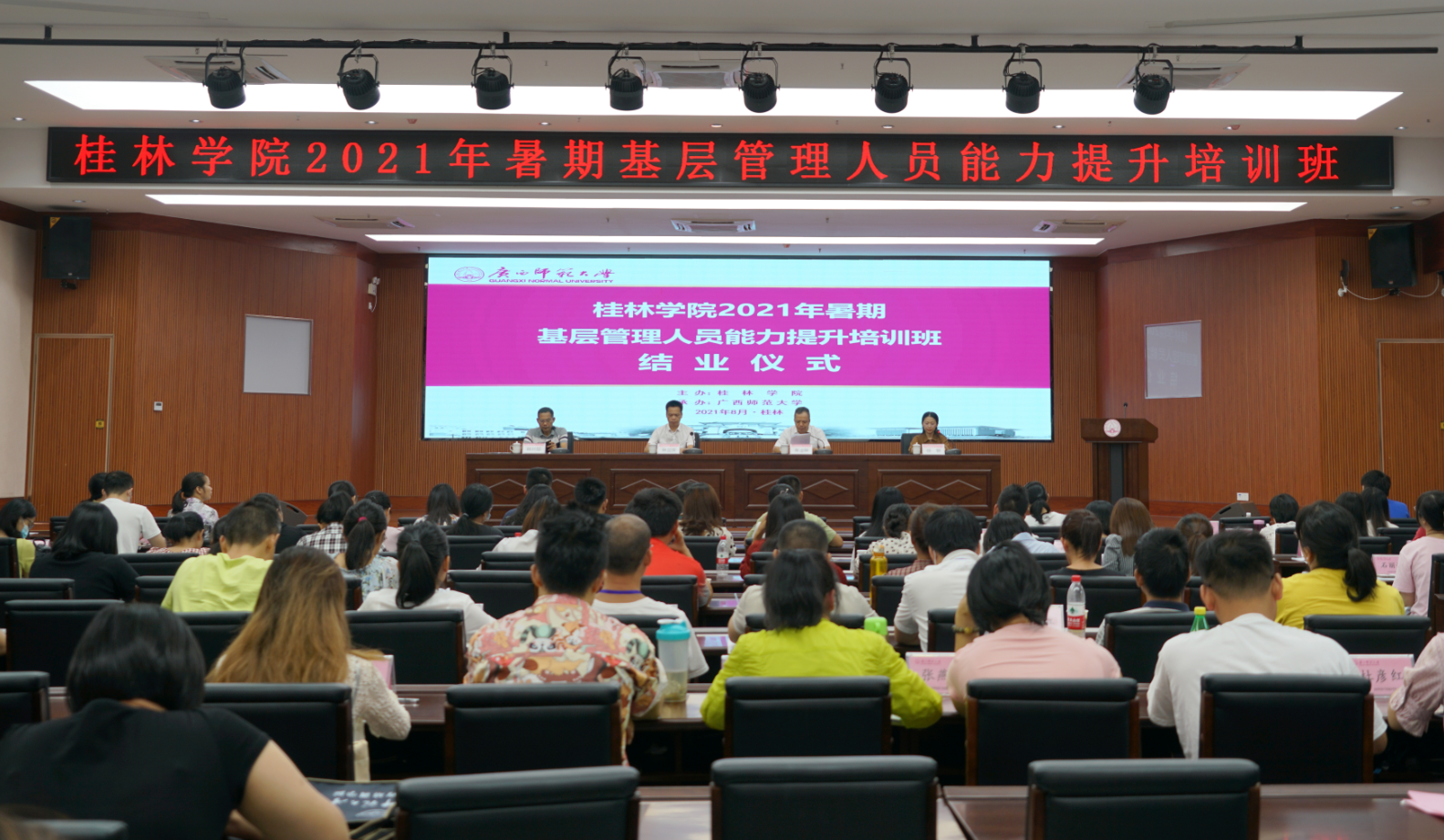 8月2日下午,桂林學(xué)院基層管理人員能力提升培訓(xùn)班結(jié)業(yè)儀式在廣西師范大學(xué)育才校區(qū)國(guó)際教育交流中心報(bào)告廳舉行,共有來(lái)自桂林學(xué)院的98名基層管理人員參加了這次為期三天的培訓(xùn)。廣西師范大學(xué)黨委常委、組織部部長(zhǎng)林國(guó)慶,桂林新城投資集團(tuán)黨總支書(shū)記、董事長(zhǎng)、總經(jīng)理、桂林學(xué)院董事長(zhǎng)周道林,桂林學(xué)院校長(zhǎng)楊樹(shù)喆等出席結(jié)業(yè)儀式。廣西師范大學(xué)干部教育培訓(xùn)學(xué)院辦公室主任許鋼主持結(jié)業(yè)儀式。