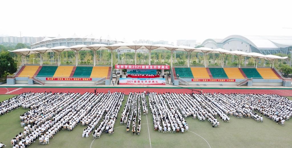 9月17日上午,桂林學(xué)院2021級新生開學(xué)典禮在學(xué)校田徑場舉行。2021級來自全國各地的3160名新生和新生親友通過現(xiàn)場與視頻直播相結(jié)合的形式,共同參加和觀看了開學(xué)典禮。桂林學(xué)院董事長周道林,桂林學(xué)院校長楊樹喆以及學(xué)校董事、監(jiān)事、校領(lǐng)導(dǎo)出席典禮。各二級學(xué)院、職能教輔部門主要負(fù)責(zé)人,各黨總支書記、副書記,全體新生輔導(dǎo)員,教師代表,校友代表參加典禮。開學(xué)典禮由校黨委書記唐文紅主持。