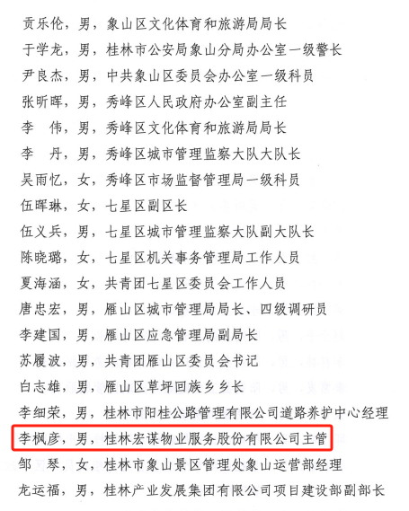 新城投集團(tuán)下屬宏謀物業(yè)公司李楓彥同志獲環(huán)廣西公路自行車世界巡回賽桂林市籌備工作先進(jìn)個(gè)人榮譽(yù)稱號(hào)