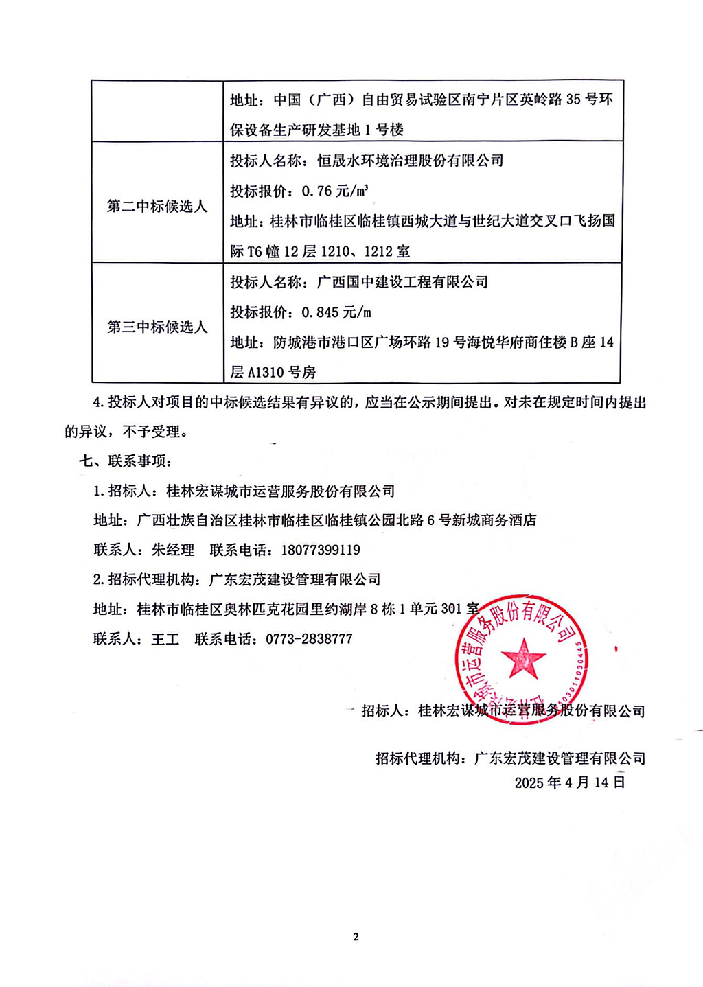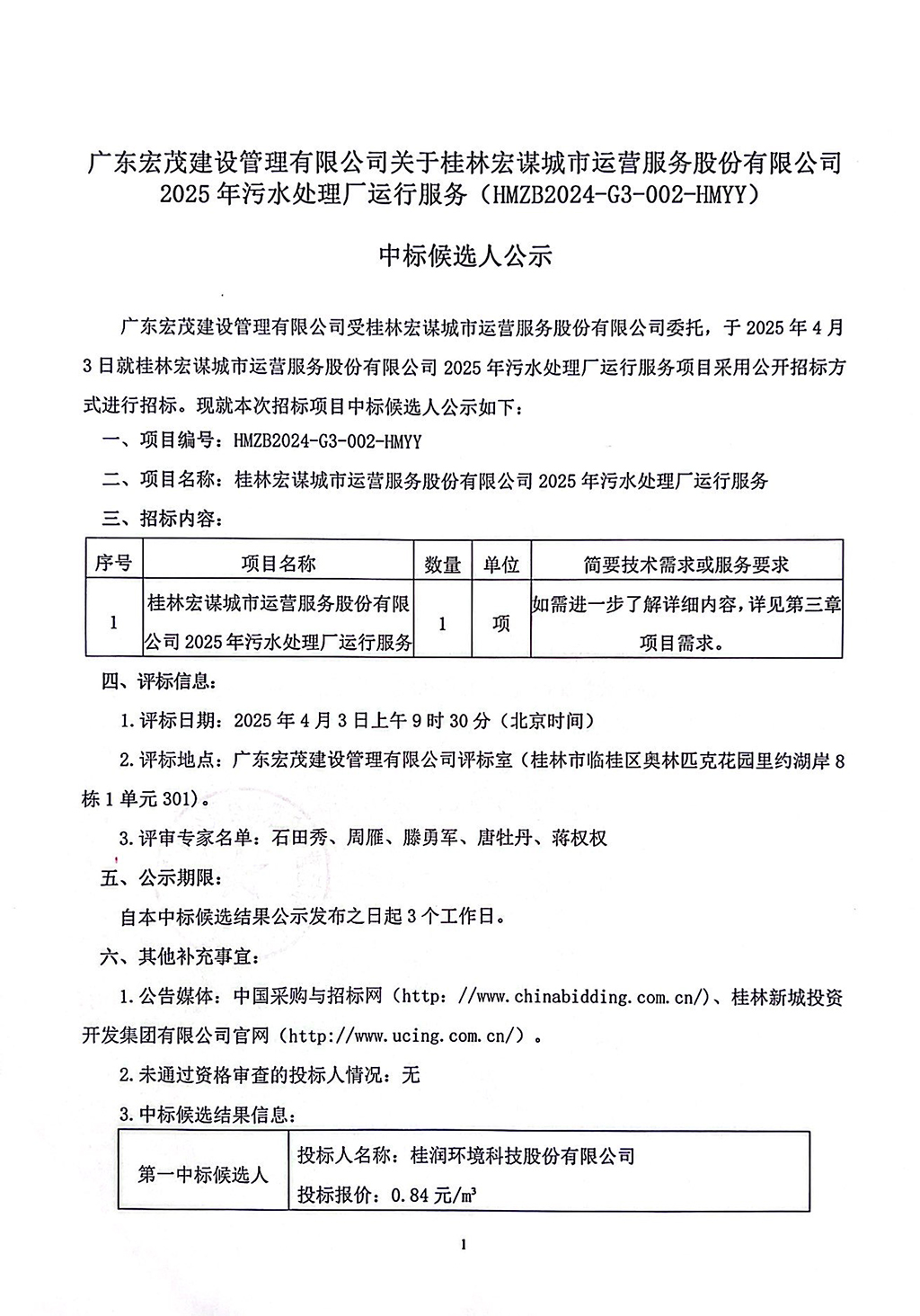 廣東宏茂建設管理有限公司關(guān)于桂林宏謀城市運營服務股份有限公司2025年污水處理廠運行服務(HMZB2024-G3-002-HMYY)中標候選人公示